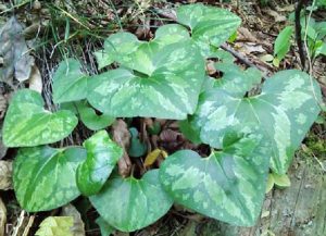 多年生草本;根状茎粗短,根丛生,稍肉质,直径2-3毫米,有浓烈的麻辣味。叶片长卵形、卵形或三角状卵形,长10-15厘米,宽6-11厘米,先端急尖或渐尖,基部耳状深裂,两侧裂片长约4厘米,宽4-6厘米,通常外展,叶面中脉两旁有白色云斑,偶无,具疏生短毛,叶背可见细小颗粒状油点,脉上和叶缘有柔毛;叶柄长10-20厘米,有柔毛;芽苞叶窄卵形,长1.5-3.5厘米,宽1-1.5厘米,先端渐尖,边缘有睫毛。