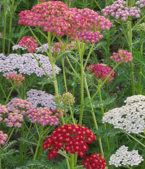 蓍草在长茎上开出一簇簇黄色、白色、鲑鱼、粉红色或红色的花朵。它们通风的灰绿色叶子也很吸引人。