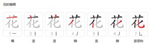 【花字写法】“艹”扁“化”大。“艹”居上居中,“亻”窄““𠤎”宽,顶部左右齐平,底部“𠤎”高;“亻”首笔撇起笔于“艹”左竖下;“𠤎”撇笔斜跨横中线、竖中线,乚(竖弯钩)的竖段在竖中线右侧。