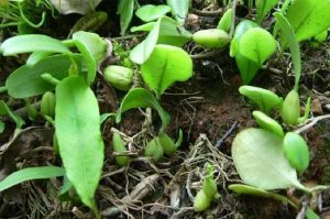 小绿石豆兰,附生植物。根茎匍匐,横生,多分枝,节多,节处丛生细而长的须根,上面密生假鳞茎。假鳞茎绿色,肉质肥厚,长卵状圆柱形,顶端稍窄。叶单生于假鳞茎的顶端,先端微凹或钝尖,基部楔形,全缘,中脉明显;无柄。