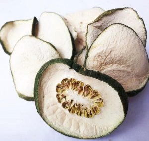 2、香圆:本品呈类球形,半球形或圆片,直径4~7cm。表面黑绿色或黄棕色,密被凹陷的小油点及网状隆起的粗皱纹,顶端有花柱残痕及隆起的环圈,基部有果梗残基。质坚硬。剖面或横切薄片,边缘油点明显;中果皮厚约0.5cm;瓤囊9~11室,棕色或淡红棕色,间或有黄白色种子。气香,味酸而苦。