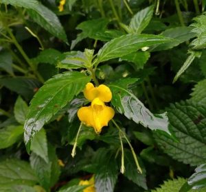 黄凤仙花,又名牯岭凤仙花。一年生草本,高可达90厘米。茎粗壮,肉质,直立或下部斜升,有分枝,无毛,下部节膨大,有多数纤维状根。叶互生;叶片膜质,卵状长圆形或卵状披针形,稀椭圆形,长5-10厘米,宽3-4厘米,先端尾状渐尖,基部楔形或尖,边缘有粗圆齿状齿,齿端具小尖,两面无毛,侧脉5-7对,弧状弯曲;叶柄长4-8厘米。总花梗连同花梗长约1厘米,果时长可达2厘米,仅具1花,中上部有2枚苞片;苞片草质,卵状披针形,长约3毫米,宿存;花淡黄色;侧生2萼片膜质,宽卵形,长约10毫米,宽5-6毫米,先端具小尖,全缘,有9条细脉;旗瓣近圆形,直径约10毫米,先端微凹,背面中肋具绿色鸡冠状突起,顶端具短喙尖;翼瓣具柄,长15-20毫米,2裂,下部裂片小,长圆形,先端渐尖成长尾状,上部裂片大,斧形,先端钝,外缘近基部具钝角状的小耳;唇瓣囊状,具黄色条纹,基部急狭成长约8毫米钩状的距,距端2浅裂。雄蕊5,花丝线形,上部略扩大,花药卵球形,顶端钝;子房纺锤形,直立,具短喙尖。蒴果线状圆柱形,长3-3.5厘米。种子多数,近圆球形,褐色,光滑。花期7-9月。