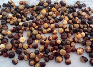 2、天师栗(《益部方物略记》),又名:猴板栗、刺五加。落叶乔木,高达25米。掌状复叶对生;叶柄长6~15厘米,被短柔毛;小叶片5~7,倒卵状长椭圆形或卵状披针形,长10~20厘米,宽3~8.5厘米,先端窄尖,基部宽楔形或近圆形,边缘有细锯齿,上面主脉上疏生细柔毛,下面密生细柔毛,小叶柄有短柔毛。圆锥花序顶生,长达35厘米;总花梗长达10厘米,花梗被有细柔毛;雄花和两性花同株而疏生;花白色,长1~1.5厘米;花萼筒形,不整齐的5浅裂,裂片近圆形,外面密生细柔毛;花瓣4,椭圆形,上2瓣较窄长,外面和边缘密生细柔毛;雄蕊6~8;两性花的子房上位,卵形。蒴果卵形或倒卵形,顶端突起而尖,外表密生黄褐色斑点。种子1~2枚,圆球状,种脐约为底部的1/3。花期5~7月。果期7~9月。野生或栽培。分布湖北、湖南、四川、贵州、陕西等地。