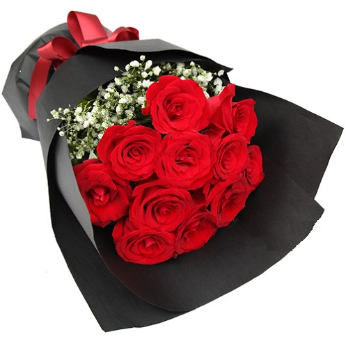 鲜花材质:11朵红玫瑰,2枝多头白百合,黄莺垫底