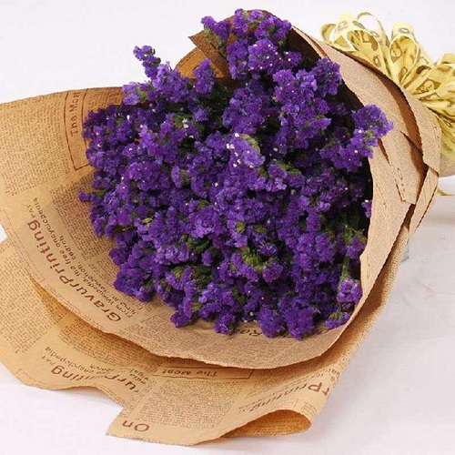 鲜花包装:白色瓦楞纸内衬,中间紫色瓦楞纸,外围再次白色瓦楞纸围裹,配精致丝结装饰,圆形花束