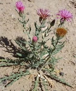 多年生草本,高15~30厘米。茎直立,上部多分枝,全株被白色绒毛;茎基部与基生叶柄基部有白色长绒毛的团块,形如棉花团。基生叶丛生,叶片线状披针形,边缘为不规则的羽状深裂,裂片极度卷曲;茎生叶互生;有长柄。头状花序顶生,总苞片多列,管状花紫红色。瘦果长椭圆形,有白色冠毛。