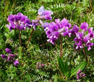 轮叶棘豆:多年生草本,植株高10-15cm。茎极短缩,长约2-3cm,基部被宿存的托叶和叶柄所包。叶长4-5cm;托叶披针形,膜质,密被淡黄色长柔毛和腺点;叶柄与叶轴疏被长柔毛和腺点;小叶多数,轮生,卵形或长圆形,长2-3cm,宽约1mm,边缘内卷,两面密被短柔毛和腺点。花3-6朵排成总状花序;总花梗短于叶,密被长柔毛和腺点;苞片卵形,长约1cm,密生腺点;花萼长约1.4cm,密被白色、黑色的长柔毛和腺点,萼齿长及萼管的1/4;花冠紫色,旗瓣长约2.4cm,翼瓣长约2cm,龙骨瓣与翼瓣近等长,先端的喙长约2mm;子房密被绢质长柔毛。荚果镰状长圆形,长2-3cm,宽5-7mm,被白色或与黑色混杂的长柔毛和疣状腺点。花、果期5-8月。
