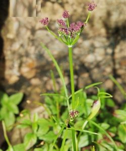 城口东俄芹又名:太白东俄芹,红花芹。多年生草本,高30-60厘米。主根短,圆锥形,褐色。茎直立,有分枝,表面有时略带淡紫色,除花序梗及伞辐顶端粗糙外,其余平滑。基生叶和下部的茎生叶有柄,柄长6-12厘米;叶鞘膜质抱茎,有脉数条;叶片轮廓呈阔披针形,长5-8厘米,宽约5厘米,2-3回羽状分裂,第1回羽片有短柄,末回裂片长5-10毫米,宽1.5-2毫米,顶端尖,边缘略增厚,中脉1条;茎上部的叶柄鞘状,叶片1-2回羽状分裂,裂片长1.5-2.5厘米,宽约1毫米,顶端的裂片明显地长于侧面的裂片,全缘。序托叶的叶柄呈鞘状,裂片1-3,线形。复伞形花序顶生或侧生,顶生的花序梗较粗壮,侧生的花序梗细弱;伞辐8-22,近等长或不等长;小总苞片无或有时存在;小伞形花序有花10-25,花柄不等长;萼齿细小,卵形或半圆形;花瓣紫红色,长倒卵形,长1-1.2毫米,宽不过0.8毫米,基部狭窄呈爪状,顶端钝或向内微凹;花丝与花瓣近等长或稍短,花药卵圆形,紫红色;花柱基圆盘状,花柱短,向外反曲。分生果圆心形或阔卵形,长约2毫米,主棱5,丝状,合生面收缩,胚乳腹面微凹,每棱槽有油管3。花果期9月。
