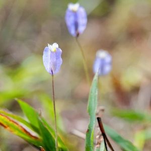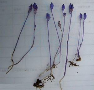 三品一枝花,又名蛆儿草。一年生小草本,高10-30cm。根茎短,须根肉质。基生叶少数,线形或披针形,长1-1.5cm,宽1-3mm,先端急尖,平行脉,中脉不明显;膜质;茎生叶2-4片,紧贴于茎上,线形,长1-1.8cm。苞片披针形,长约4mm;花单生或少数簇生于茎顶,具3翅,翅由花被裂片中部起直达子房的基部,长约10mm,宽约2.5mm,蓝色或紫色;花被裂片6,带黄色,外轮裂片卵状三角形,长约1.5mm,内轮裂片很小,长不及0.5mm;雄蕊3,药室横裂,药隔宽,背部2个略分叉的鸡冠凸起;子房下位,花柱线形,柱头3裂。蒴果倒卵形,横裂。种子多而小,条形。花期10-11月。