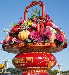 2024年9月22日,北京,天安门广场“祝福祖国”蔬果花篮主体结构亮相,吸引众多市民游客打卡、拍照留影。
