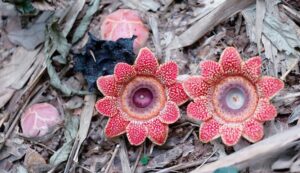 在保护区山坡至半山坡的原始雨林中,猩红色花朵零星分布于林下腐殖层,直接从宿主扁担藤的根部萌出。作为我国大花草科唯一分布的物种,寄生花无茎、无根、无叶,不具备光合作用能力,完全依赖寄生于扁担藤根部获取生长所需养分,每年仅在9月至12月繁殖期开花。因其生活史特殊、行踪隐秘,在植物学界素有“植物幽灵”之称。