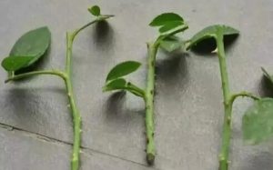 (2)将月季花枝条进行修剪,插口不能够太长,距离第一片叶子1cm-3cm最好,因为如果枝条太短,不能够深入插进去;太长了又能够埋掉第一片叶子,不利于日后发芽。
