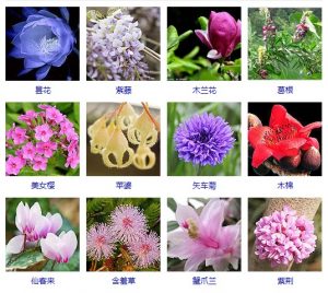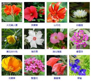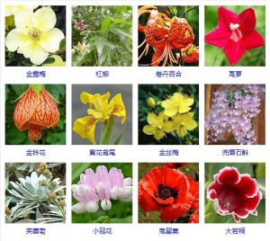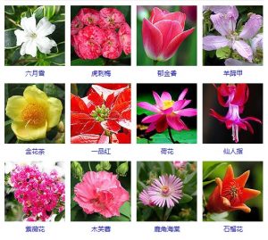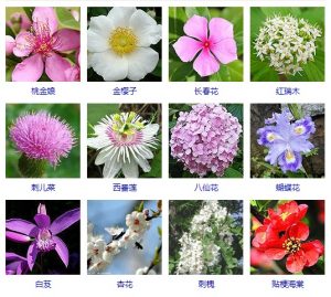梅花、桃、牡丹、海棠、玉兰、木笔、紫荆、连翘、金钟、丁香、紫藤、春鹃 杜鹃花、石榴花、含笑花、白兰花、茉莉花、栀子花 、桂花、茉莉花、木芙蓉、 腊梅、免牙红、银芽柳、山茶花、迎春。