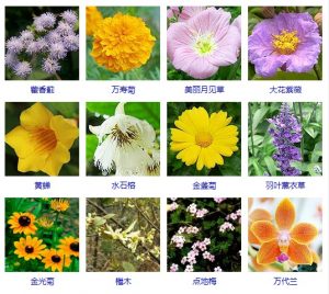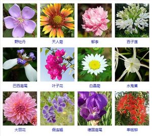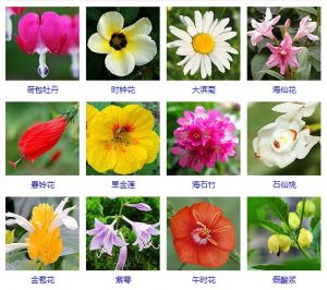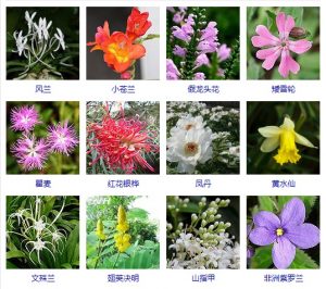 绣线菊、八仙花、马蔺、石蒜、石竹、五彩石竹、百喜草、万寿菊、鸡冠花、牵牛花、三色堇、一串红、翠菊、虞美人、仙客来、天门冬、红掌、大丽花、姜花、天竺葵、孔雀草、含羞草、报春花、羽衣甘蓝、旱金莲、四季海棠、福禄考、金盏菊、小丽花、金鱼草、何氏凤仙、夜来香、瓜叶菊、长寿花、蝴蝶兰、白三叶、 一品红、兰花、水仙、仙人掌、昙花、美女樱、君子兰、朱顶红、常夏石竹、玉簪、紫罗兰、仙人球、芦荟、藿、香蓟、熏衣草、风信子、石斛兰、耧斗菜、银叶菊、锦葵、醉蝶花、银边翠、紫芳草、补血草、凤仙花、美兰菊、叶下珠、二月兰、龙面花、小苍兰、荷包牡丹、黑心菊、紫萼、诸葛菜。
