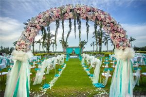 许多婚庆公司备有拱门可以租用,你们也可以用鲜花将之稍做改造,那样效果就会有所不同。如果自己设计的话,绿色植物、藤类、鲜花、精致的纱、缎带还有气球都可以成为组成花门的好元素。