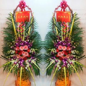 开业花篮条幅恭贺格式:左边:祝XXX开业大吉生意兴隆,右边:XXX恭贺