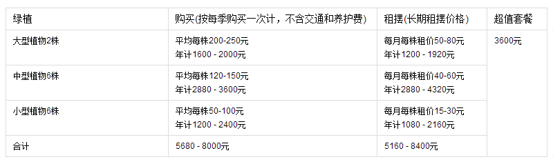 任选大型植物2株、中型植物6株、小型植物6株;或大型植物2株、中型植物4株、小型植物10株,等组合,名贵植物按中型绿色植物计算。 另送10棵净化空气、吸收甲醛的小植物。