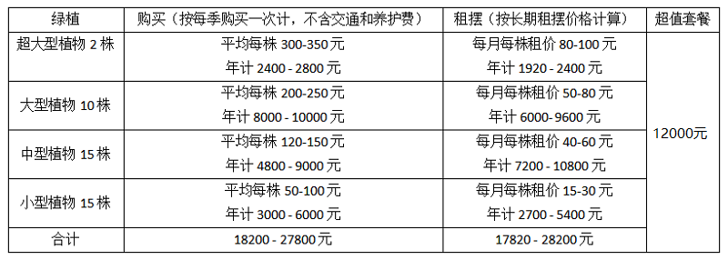 任选超大型植物2株、大型植物12株、中型植物15株、小型植物30株。名贵植物按中型绿色植物计算, 一株超大型植物也可根据客户要求更换成两株大型植物。或大型植物17株、中型植物20株、小型植物30株。另送50棵净化空气、吸收甲醛的小植物。