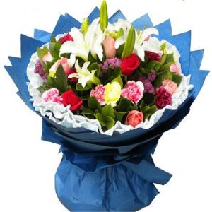 感恩节鲜花:11朵粉色康乃馨加11朵红玫瑰加11朵粉玫瑰加19朵白百合花束