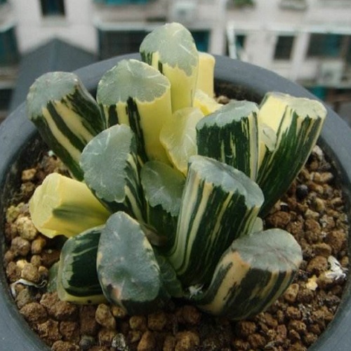 万象锦为万象的锦斑品种,为百合科十二卷属多肉植物,叶面上有不规则斑纹,以黄色最为常见,罕有橘红、淡粉、银白色,其他特征与万象相同,但长势较弱。万象锦喜温暖、干燥和阳光充足的环境,不耐寒冷,怕烈日暴晒,夏季要注意适当遮阳,另外万象锦的生长要求有较大的昼夜温差。