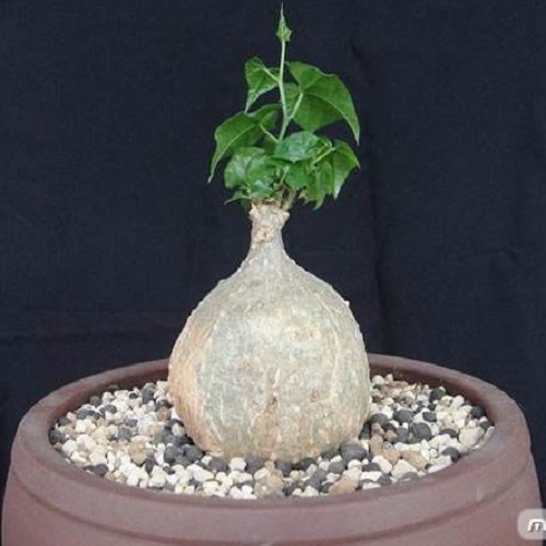 睡布袋为肉质块根植物,茎块部分外露在地表面,直径能达1米,看上去像一块表面圆滑的大石头,表面呈土黄色,表皮坚硬,外形酷似大肚皮和尚的肚皮又似一放倒于地上的大布袋,因而得名。睡布袋是著名块根观赏植物,原产非洲东部,由于南非的气候与我国差异,引种的种子发芽率极低,长期一来,人们只能块根引种。