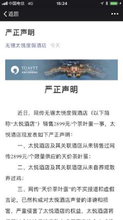 无锡太悦度假酒店19日通过其官方公众号发出严正声明:该酒店及其关联酒店从未销售过网传2899元/个限量供应的天价茶叶蛋。