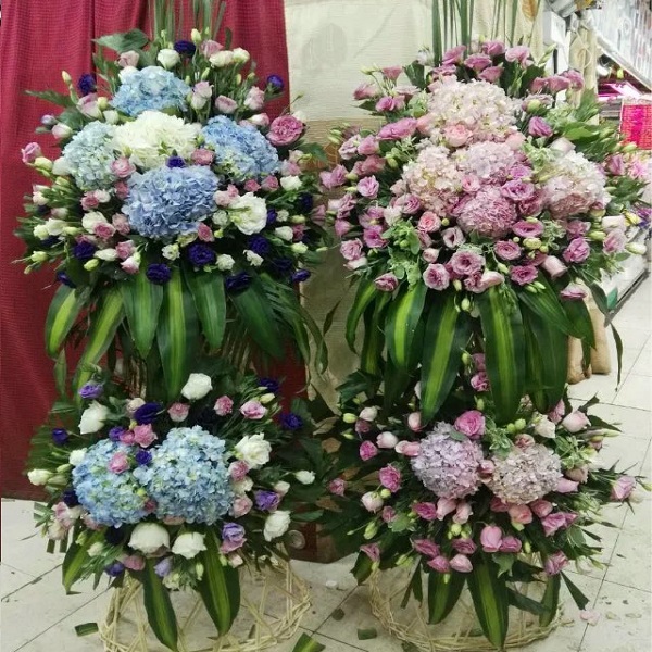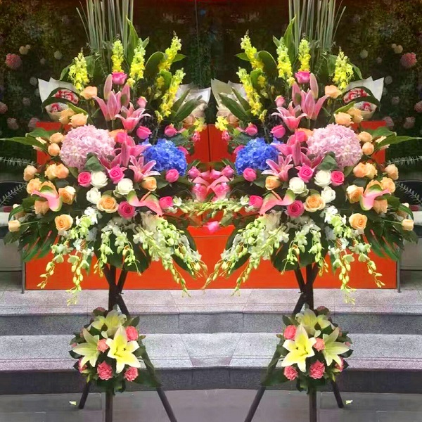 开张花篮一般分上下2层,或者上中下3层的落地花篮,1层的商务花篮用的比较少,一般是放在上楼道里面;商务开张花篮也可以做4层,5层,6层的,像这样的商业花篮档次比较高,一般用在集团、家具城等大型、隆重的商务开业庆典。