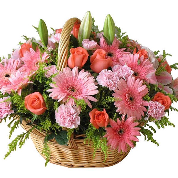 财运吉祥小花篮:粉色扶郎花、红色扶郎花、橘色扶郎花、多头粉百合,搭配适量散尾葵、龟背叶、剑兰。