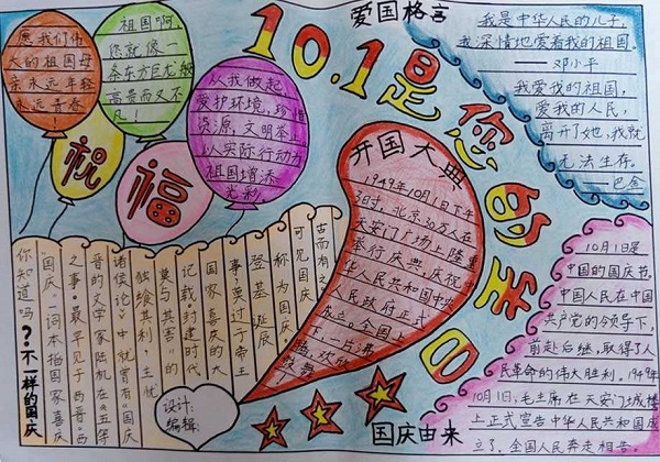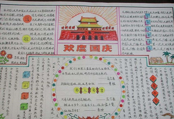 国庆节手抄报内容50字至100字,国庆节手抄报大全,国庆手抄报内容资料,国庆节的手抄报的内容,国庆节手抄报简单好看,国庆手抄报简单又漂亮,国庆节的手抄报,国庆节手抄报简单,国庆节手抄报素材。在学校,国庆节手抄报是第二课堂的一种很好的活动形式,和黑板报一样,国庆节手抄报也是一种很好的宣传工具。不仅省力,还可以提高学生国庆节知识。