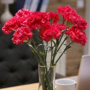 红色多头康乃馨花语:我的心为你而痛、赞赏、崇拜、迷恋、亲情、热烈的爱、热情、受伤的心、思念、相信你的爱、祝母亲健康长寿、祝你健康