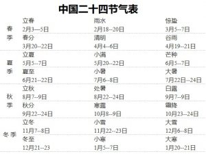 二十四节气表是中国古代订立的一种用来指导农事的补充历法,是中国古代劳动人民长期经验的积累和智慧的结晶。是在春秋战国时期形成的。由于中国农历是一种“阴阳合历”,即根据太阳,也根据月亮的运行制定的,因此不能完全反映太阳运行周期,但中国又是一个农业社会,农业需要严格了解太阳运行情况,农事完全根据太阳进行,所以在历法中又加入了单独反映太阳运行周期的“24节气”,用作确定闰月的标准。二十四节气能反映季节的变化,指导农事活动,影响着千家万户的衣食住行。二十四节气是根据太阳在黄道(即地球绕太阳公转的轨道)上的位置来划分的。