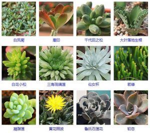 - 白凤菊,唐印,千代田之松,大叶落地生根,白花小松,三角琉璃莲,仙女杯,若绿,凝脂莲,黄花照波,鲁氏石莲花,初恋