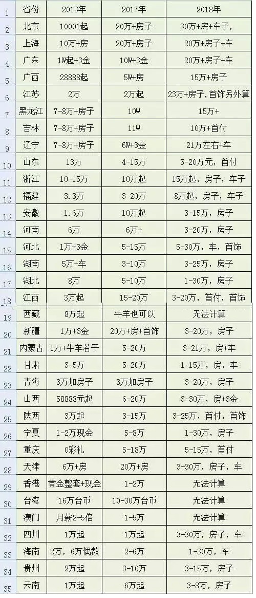 最近,出现了一张刚出炉不久的全国彩礼排行榜。也引起了网友们热议,不看不知道,一看真的吓一跳。虽然这些数据没有官方统计数据那么准确,但大部分都是一些当地的网友们说的他们当地的实情。数据虽然没有权威性,但也反映出高彩礼这一些现实问题是存在的。