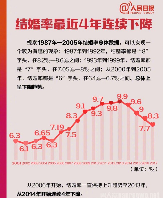 ①从2006年开始,结婚率一直保持上升趋势至2013年,从2014年开始连续4年下降。