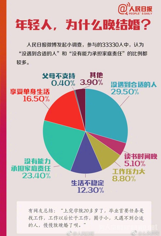 年轻人越来越晚婚了,也有有网友解释说:上完学就20多岁了,毕业后首要任务是找工作,然后就忙于工作,圈子小,遇不到合适的人,渐渐就晚婚了呗。大学毕业后马上找工作,然后买房、结婚、生小孩儿,十年之后安定下来,人生从此定型,仿佛所有人都该按这样的时间表度过一生。但其实每个人都有自己的人生节奏,你不必按照别人的剧本度过自己的一生。总结一句话:别让任何人打乱你的人生节奏!