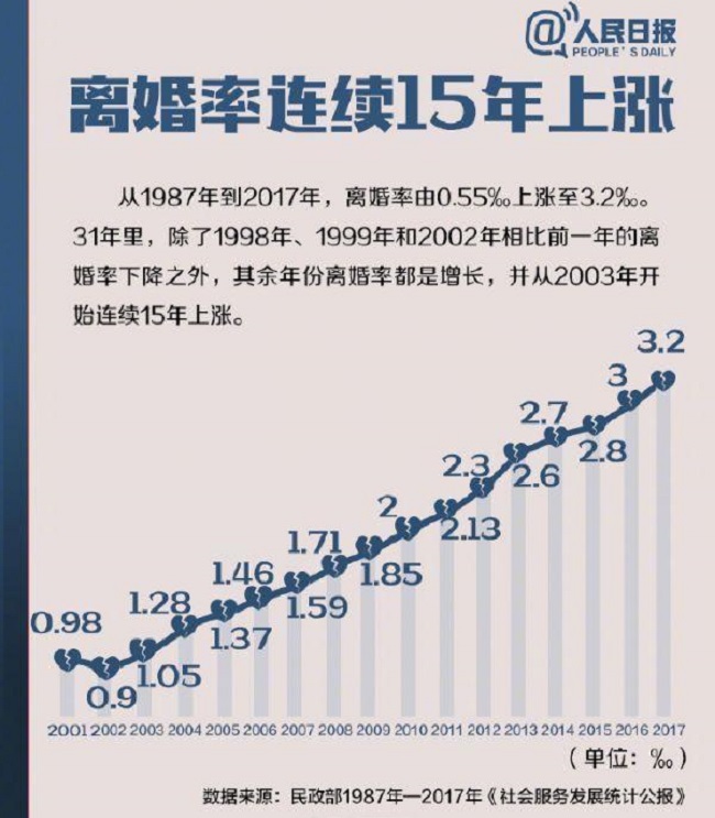 ④从1987年到2017年,离婚率由0.55‰上涨至3.2‰。