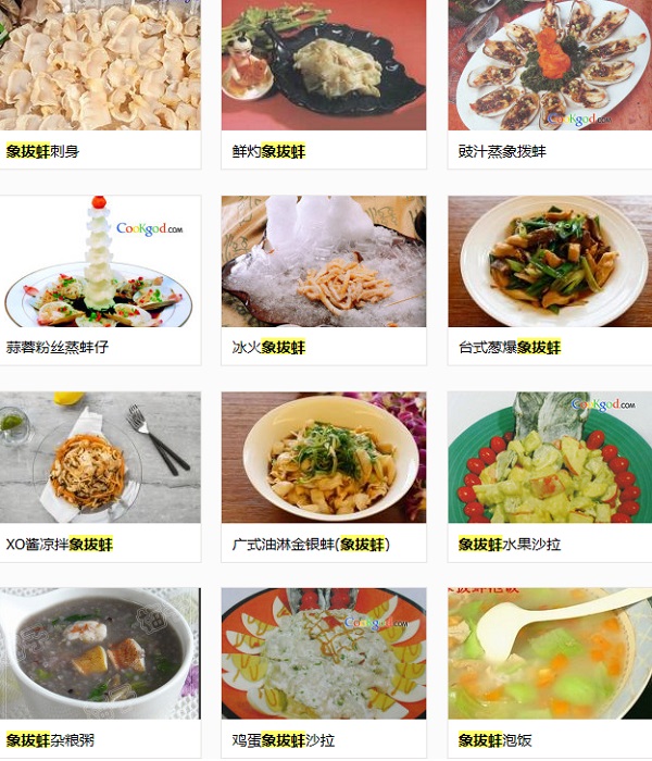 1.将象拔蚌选象鼻部分,洗净片成薄片;香菇洗净,切去根部;
