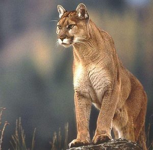 PS:美洲狮(学名:Puma concolor):又称美洲金猫,大小和花豹相仿,但外观上没有花纹且头骨较小。体长130-200厘米,尾长约100厘米,肩高55-80厘米,体重35-100千克,为猫亚科中最大者。雄性比雌性大近1倍。躯体均匀,四肢中长,趾行性。头大而圆,吻部较短,视、听、嗅觉均很发达。犬齿及裂齿极发达;上裂齿具三齿尖,下裂齿具2齿尖;臼齿较退化,齿冠直径小于外侧门齿高度。皮毛柔软,全身为单一的灰色、红棕色或红色。前足5趾,后足4趾;爪锋利,可伸缩。尾较发达。