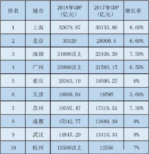 全国GDP十强排名城市