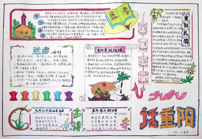 美好生活重阳节手抄报内容资料和重阳节手抄报图片大全6每年的农历九月初九是我们的重阳节,也是我们的老人节,都说百善孝为先,一个真正善良的人是对自己的情人也是非常友善的,老人可能行动有些不便,思维有些缓慢,请不要嫌弃他们,好好的善待他们。下面春暖花开小编为您带来重阳节手抄报版面设计图,栏目收集重阳节手抄报图片、九九重阳手抄报、重阳节手抄报内容、重阳节手抄报资料、重阳节敬老手抄报、敬老节手抄报作品等。为各位提供参考...赞 (0)阅读(1736)评论(0)标签:九九重阳手抄报 / 手抄报 / 重阳节 / 重阳节图片 / 重阳节手抄报 / 重阳节手抄报内容 / 重阳节手抄报名人名言 / 重阳节手抄报图片 / 重阳节手抄报图片大全 / 重阳节手抄报资料 / 重阳节敬老手抄报