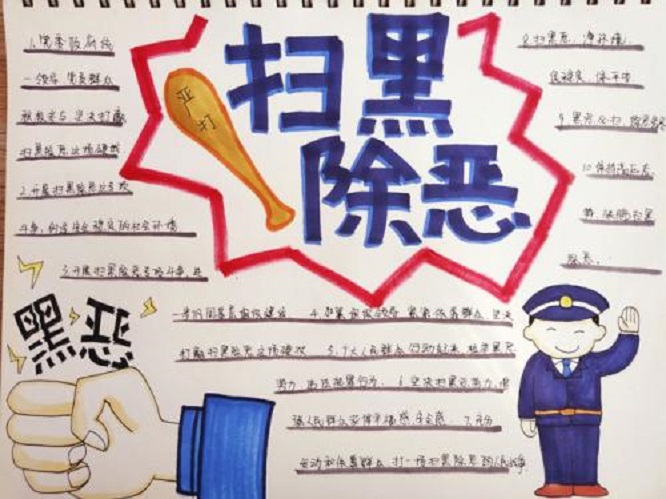 美好生活扫黑除恶手抄报以及扫黑除恶标语口号大全4黑社会作为和谐社会的一个巨大毒瘤,黑社会不仅给人民的生命财产安全带来了极大的危害,而且也影响到了整个社会的繁荣稳定,人们无不对它咬牙切齿、恨之入骨。各地开展扫黑除恶专项行动,还社会安宁。 扫黑除恶手抄报 我们的国家一直在坚持打击黑恶势力,从五年前的“打黑除恶”到现在的“扫黑除恶”,这不仅仅是一个名称上的变化,代表了更是我们的党、我们的国家对于铲除黑恶势力的决...赞 (0)阅读(2121)评论(0)标签:专项行动 / 口号 / 和谐社会 / 手抄报 / 打黑除恶 / 扫黑除恶 / 标语 / 毒瘤 / 社会 / 社会安宁 / 黑社会